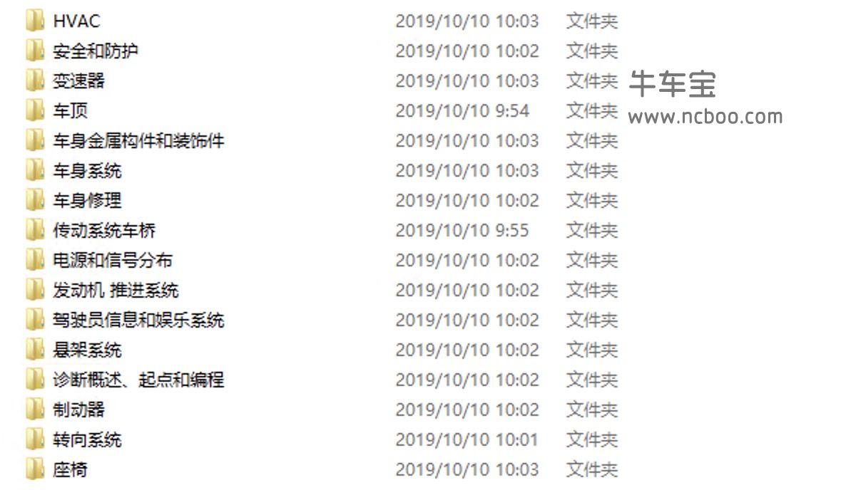 HVAC 、 传动系统车桥、 制动器、 发动机 推进系统、 变速器、 安全和防护、 座椅、 悬架系统、 电源和信号分布、 诊断概述、起点和编程、 车身修理、 车身系统、 车身金属构件和装饰件、 车顶、 转向系统、 驾驶员信息和娱乐系统。