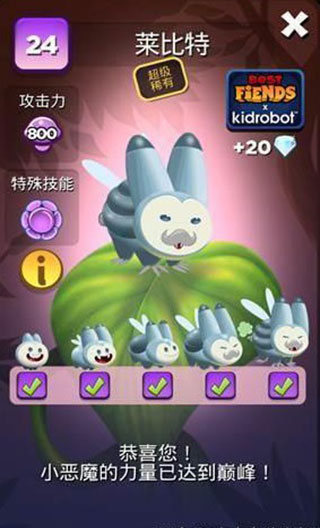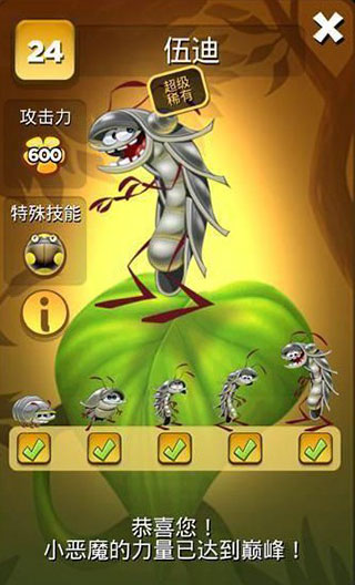 特殊技能:黄色甲壳虫,最开始的时候每回合可以将1个方块变成黄色,等到把小怪物升级到最高等级之后每回合都可以将5个方块变成黄色。