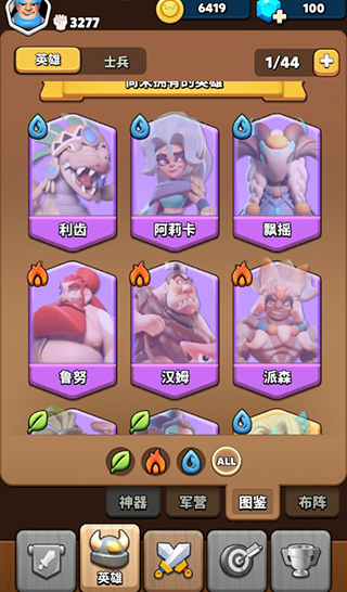玩家在英雄界面点击右下角的图鉴,即可查看冲啊原始人游戏英雄图鉴,了解各个英雄的信息。