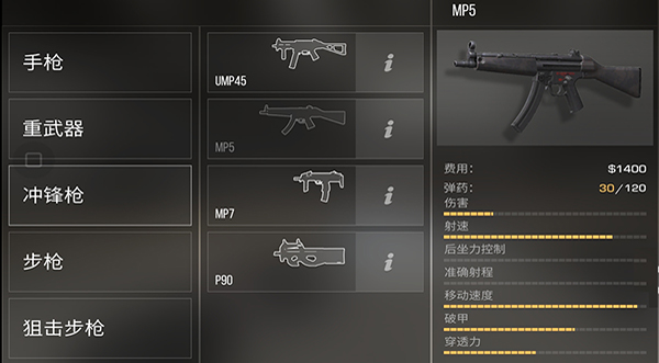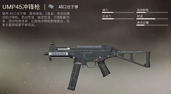 世界级的经典冲锋枪,是冲锋枪中的扛把子,除了破甲低于UMP45之外,其余实力都很强劲