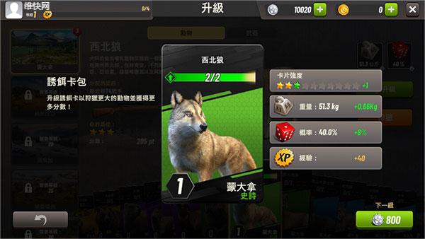 6、在动物收集册里,你可以对捕获的猎物进行升级。每一次升级,都将提升你下次打猎的分数,让你在狩猎的道路上越走越远。
