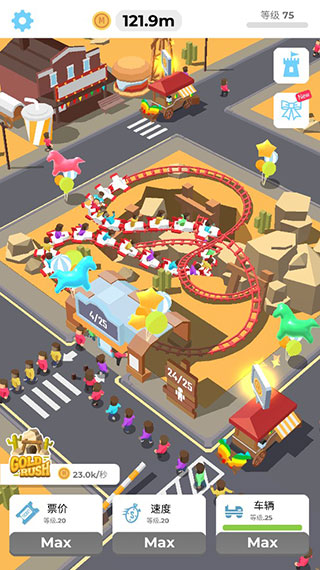 闲置过山车中文版(Idle Roller Coaster)是一款休闲模拟类游戏,本次小编给大家带来的是闲置过山车最新版,该版本是游戏目前最新的版本,能够给玩家带来更加畅快的游戏体验。清新简洁的卡通式画风,高清逼真的过山车形象,紧张而又不失欢快的背景音乐,在这里,玩家可以沉浸式体验到经营过山车游乐园的快乐。游戏玩法多样,在这里,玩家将担任过山车经营大亨,通过接待游玩的顾客来获取增长收益,在此期间你可以通过升级站台内的游戏速度、站台容量和队伍容量来提升整体的容纳量。同时你也可以通过升级票价、改进速度及车辆来改善你的过山车娱乐设施。另外,在游戏中,能够带给玩家真实的过山车的场景,而且现场还会有一些装饰物,如气球、冰淇淋车及其他丰富饰品,所以大家还在等什么,有喜欢的朋友欢迎来本站免费下载吧。